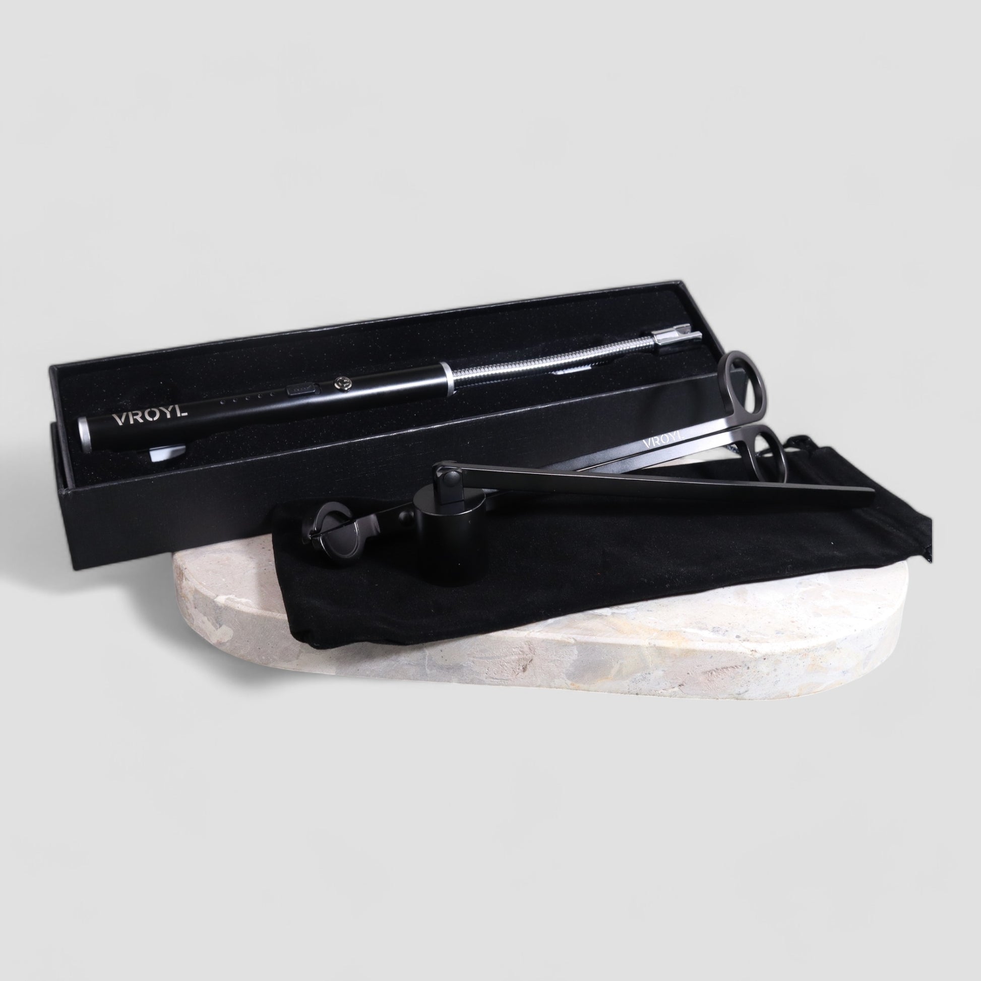Treat your candle right with our ultimate care kit. This set includes an Arc-lighter for a reliable flame, a wick trimmer, and a snuffer.